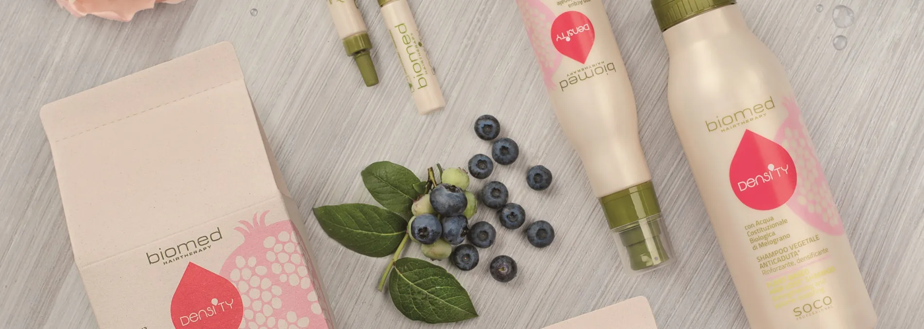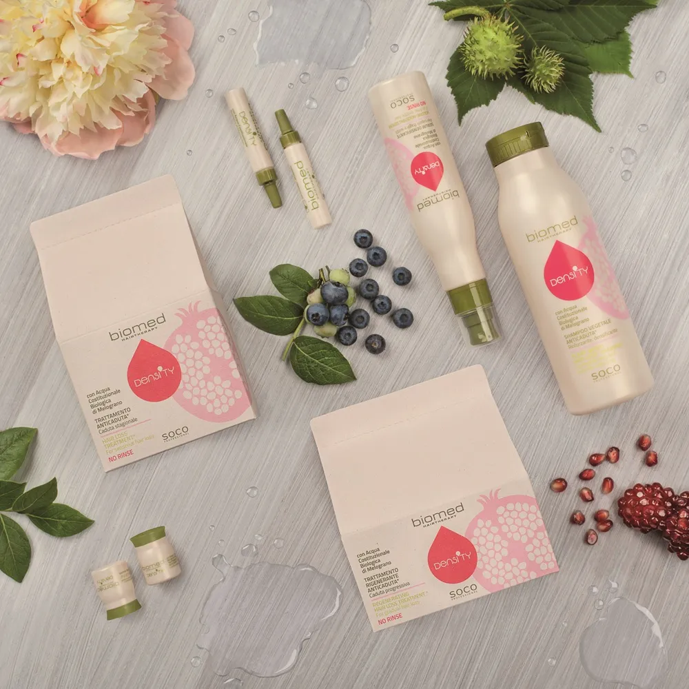Les produits Biomed Density renforcent et densifient les cheveux affaiblis, contribuant ainsi à prévenir la chute des cheveux. L’ingrédient principal est l’eau cellulaire biologique de grenade, qui stimule particulièrement la croissance capillaire grâce à ses propriétés antioxydantes et riches en vitamines. D’autres ingrédients d’origine végétale soutiennent le renforcement à la racine.