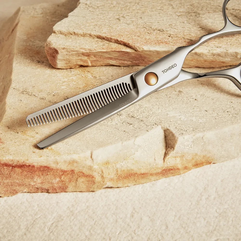 Pour un look naturel et décontracté ou pour des transitions harmonieuses, les ciseaux sculpteurs — également appelés ciseaux à effiler — sont très importants. Mais quelle est la différence entre des ciseaux sculpteurs et des ciseaux à effiler ? Les ciseaux à effiler sont dentés des deux côtés, ce qui crée de petites encoches et empêche tous les cheveux d’être coupés en même temps. Lors d’une coupe avec des ciseaux à effiler, environ 30 % des cheveux situés entre les lames sont coupés. Ces ciseaux sont principalement utilisés pour désépaissir la chevelure et doivent être maniés uniquement par des coiffeurs expérimentés, car ils sont plus difficiles à utiliser et nécessitent une grande précision.