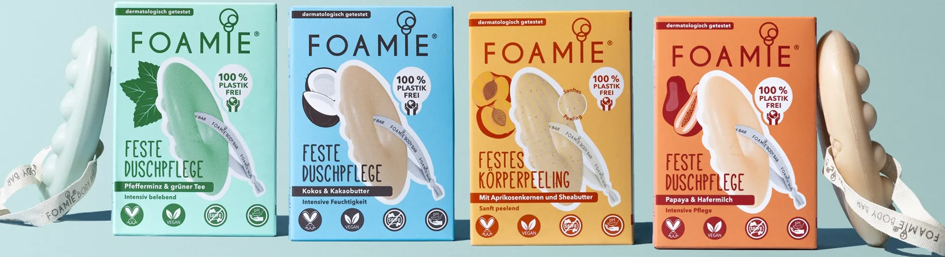 Découvrez les soins douche solides de Foamie pour votre routine de lavage. Foamie mise sur des soins respectueux de l’environnement, bons pour la peau et pour la planète. Sans plastique, véganes et au pH équilibré, ces produits assurent un nettoyage optimal sans agresser la peau.