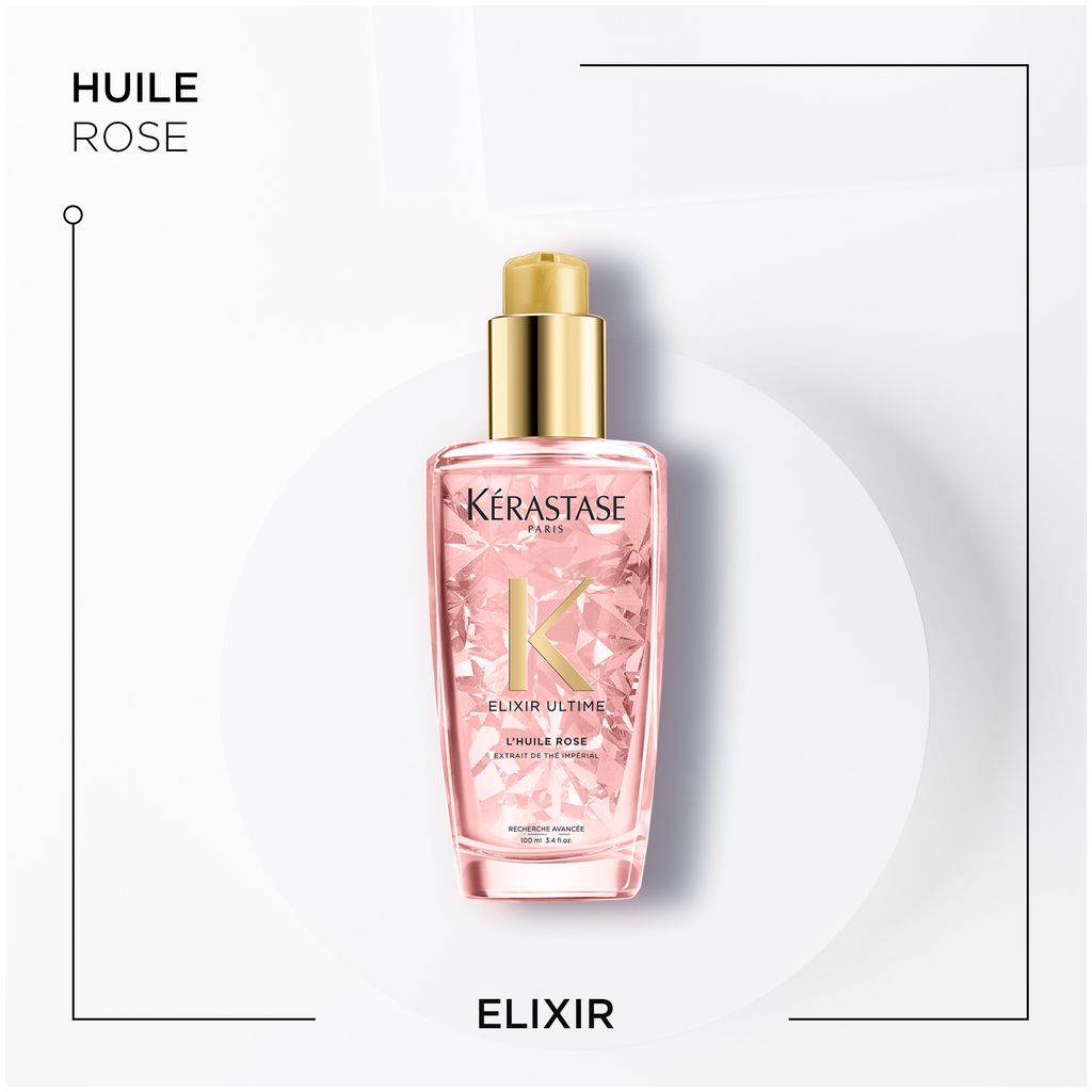 La nouvelle Huile Rose de Kérastase Elixir Ultime apporte aux cheveux colorés de la luminosité et les sublime. Les nutriments, constitués d'extraits de thé sélectionnés et d'huiles précieuses, pénètrent en profondeur dans les cheveux et assurent une brillance éclatante et durable de la couleur. L'huile de Marula, d'argan et de camélia nourrissent les cheveux jusqu'à l'intérieur de la fibre capillaire. L'huile sublimatrice a spécialement été développée pour les cheveux colorés, qui sont nourris de manière optimale, protégés des frisottis et lissés. Elle sèche les cheveux sans laisser de résidus et plus rapidement, et les fait rayonner intensément sans les alourdir. La fibre capillaire est nourrie et protégée de la chaleur jusqu'à 230°C.