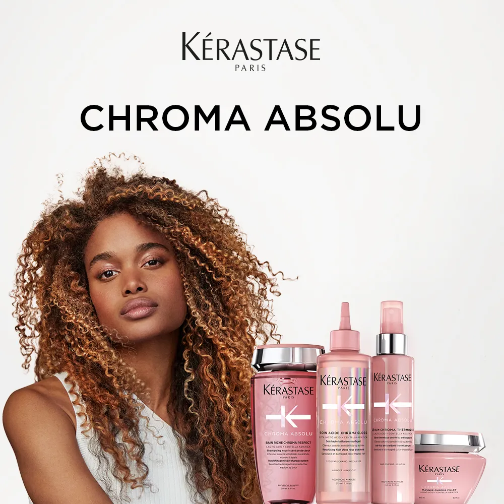 Chroma Absolu est une gamme complète et personnalisable qui nourrit la structure du cheveu de l’intérieur. Elle offre un soin sur mesure pour toutes les techniques de coloration comme le balayage, les colorations claires et foncées. Chroma Absolu révèle le secret d’une couleur vibrante et longue durée. Kérastase adopte une approche inspirée des soins de la peau, particulièrement efficace pour reconstruire et maintenir des fibres capillaires saines.