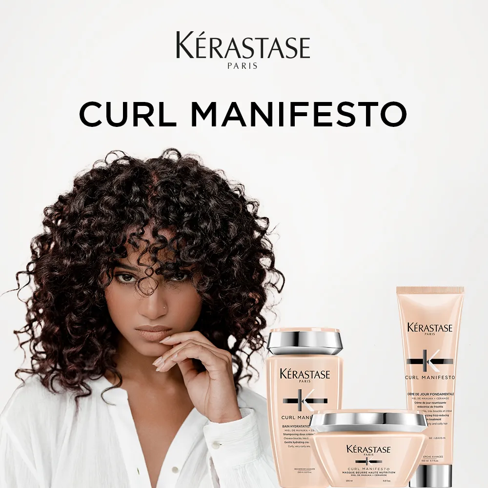 Kérastase Curl Manifesto est une ligne de soins de luxe pour les boucles, qui associe haute efficacité et simplicité d’utilisation, offrant ainsi un soutien idéal à chaque femme aux cheveux bouclés. Offrez-vous chaque jour la magie des produits innovants pour boucles de Kérastase ! Kérastase sait à quel point l’entretien et le coiffage de boucles parfaitement définies peuvent être exigeants. C’est pourquoi tous les produits sont conçus pour donner aux boucles exactement ce dont elles ont besoin pour être magnifiques : hydratation, protection anti-frizz et maintien de la forme.