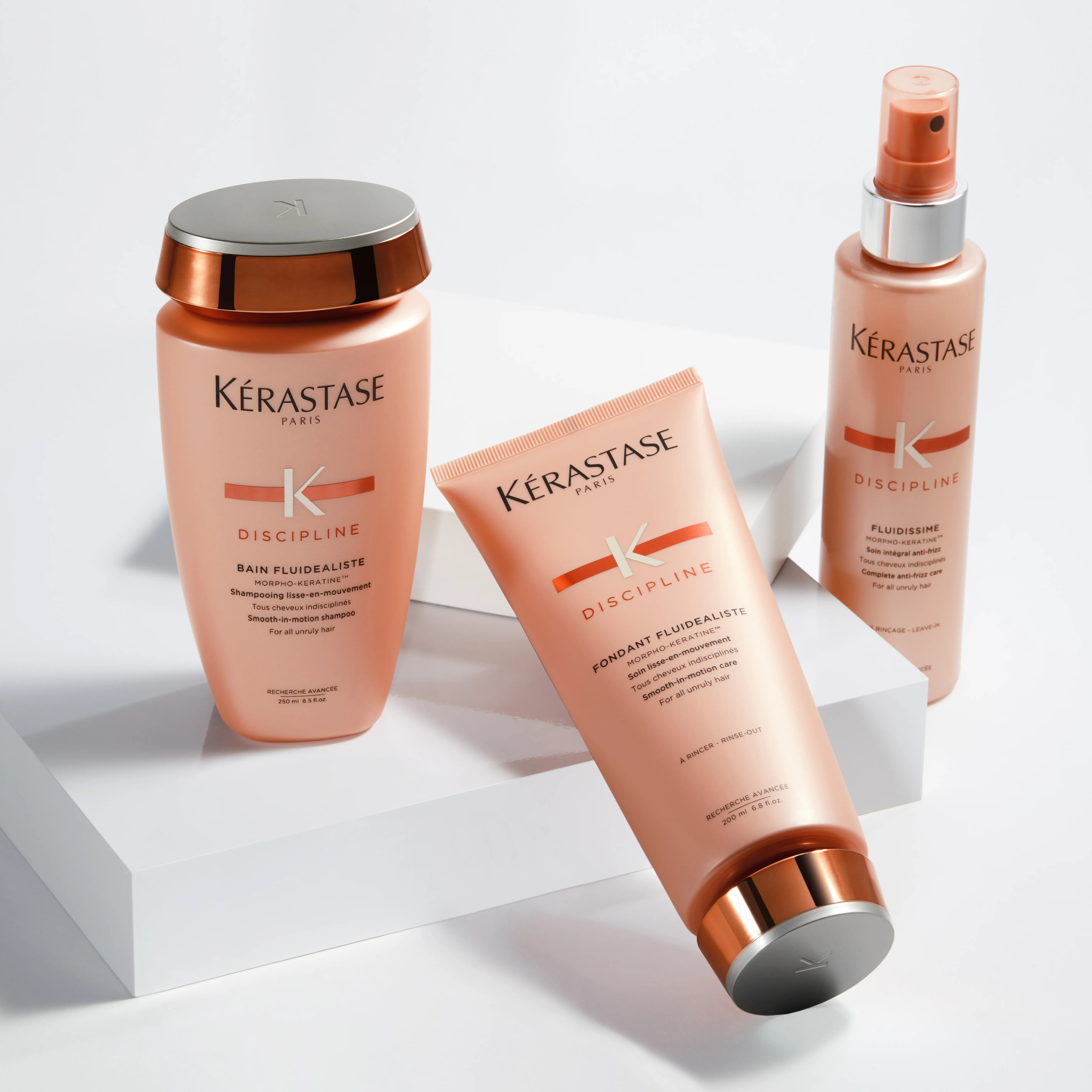 Avec les produits capillaires Kérastase Discipline, les cheveux indisciplinés sont domptés – qu’ils soient bouclés, ondulés ou simplement rebelles et difficiles à maîtriser. Le résultat : une chevelure toujours contrôlée, lisse, brillante, pleine de mouvement et d’élasticité.