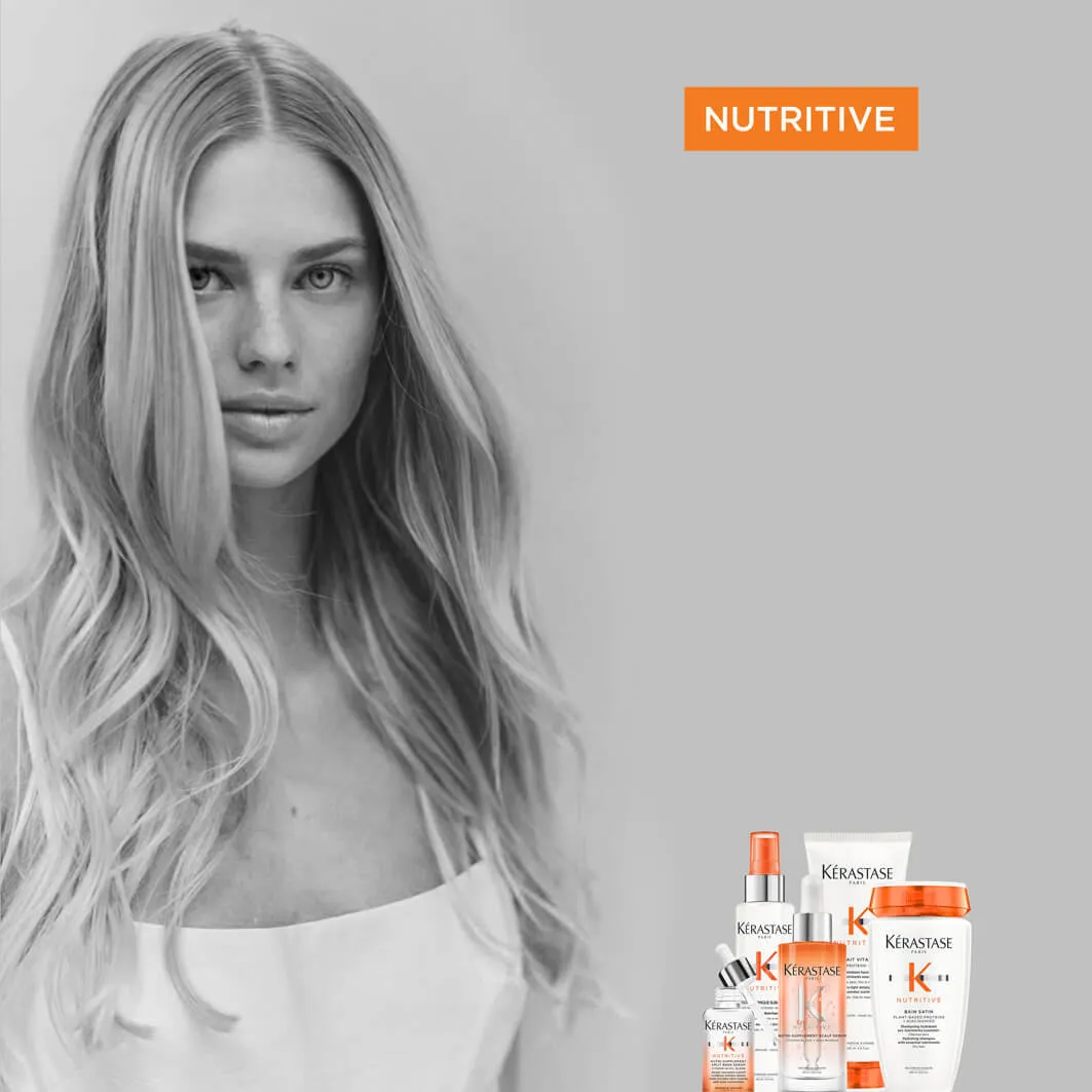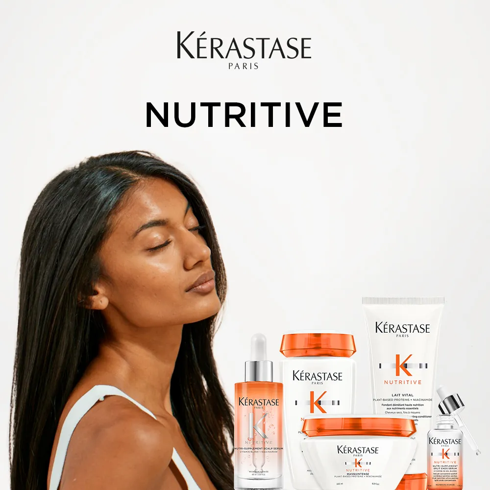 La famille Nutritive de Kérastase cible les symptômes typiques des cheveux secs et en manque de nutriments, et apporte aux cheveux, grâce à une routine de soin adaptée au degré de sécheresse, souplesse, brillance et une sensation incomparablement douce. Nutritive constitue la base du traitement des cheveux secs. La gamme de soins comprend des produits sur mesure pour chaque type de cheveux. Du shampooing Kérastase Nutritive à l’après-shampoing et au masque, en passant par le lait de soin et le sérum de nuit, un sérum pour les pointes et le protecteur thermique universel, tous les produits sont adaptés aux besoins des cheveux secs. Ces soins de haute qualité redonnent souplesse, vitalité et éclat. Après utilisation, les cheveux paraissent plus frais et plus sains.