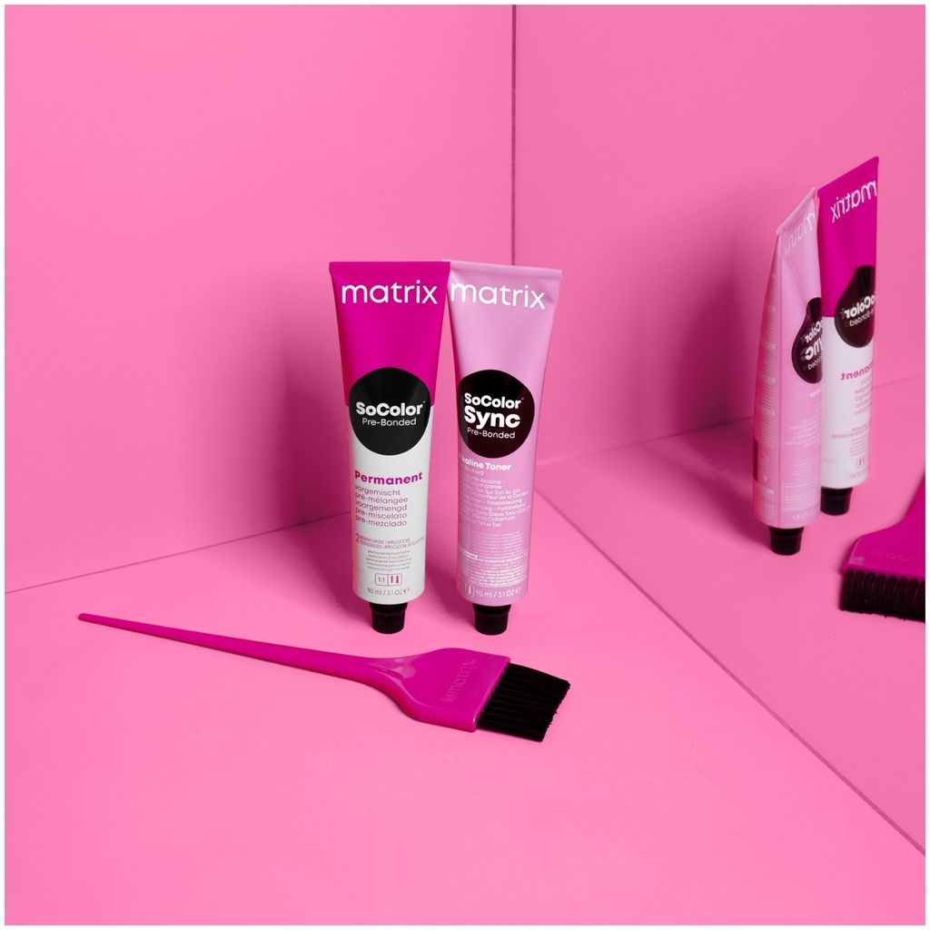 Appliquer la coloration ton sur ton dans un rapport de mélange 1:1 avec l'oxydant Matrix 3% (Matrix Socolor Beauty Crème Oxydante - 10 VOL (3%)) sur cheveux secs ou essorés. Laisser agir jusqu'à 20 minutes.