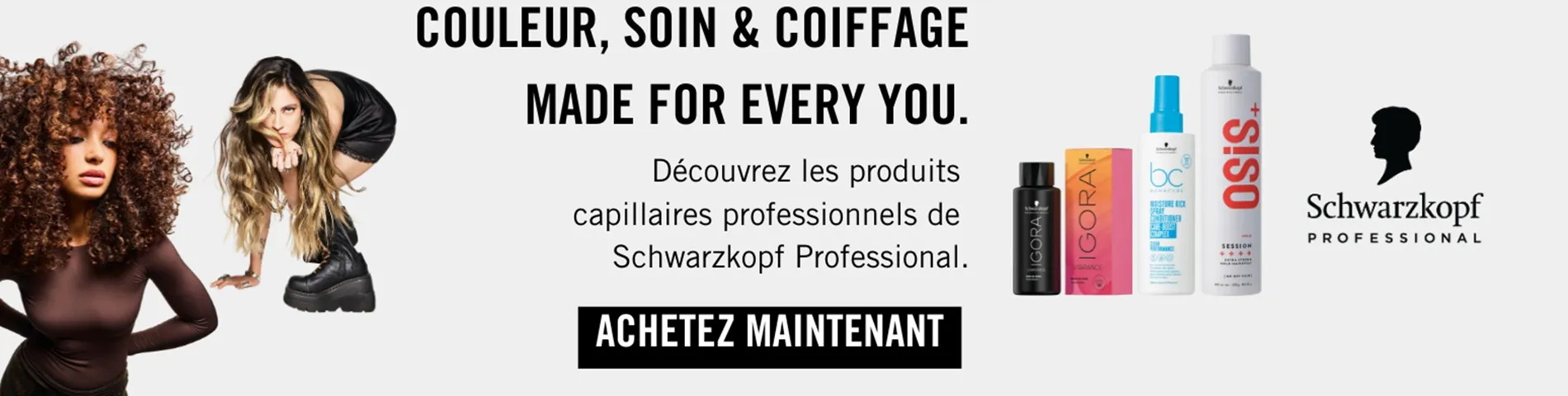 Schwarzkopf Professional offre des gammes de soins capillaires haut de gamme et exclusivement réservées aux coiffeurs, comme les lignes Bonacure adaptées à chaque besoin capillaire – dont la célèbre gamme Moisture Kick. On retrouve également les produits de coiffage mondialement connus OSIS+, qui répondent à toutes les envies de styling. En matière de coloration, Schwarzkopf Professional propose un large assortiment : les colorations haute définition Igora Royal, les colorations sans ammoniaque Essensity, ainsi que les nuances soignantes Igora Vibrance, reconnues pour leur tenue et leur éclat, afin de satisfaire tous les désirs de couleur.