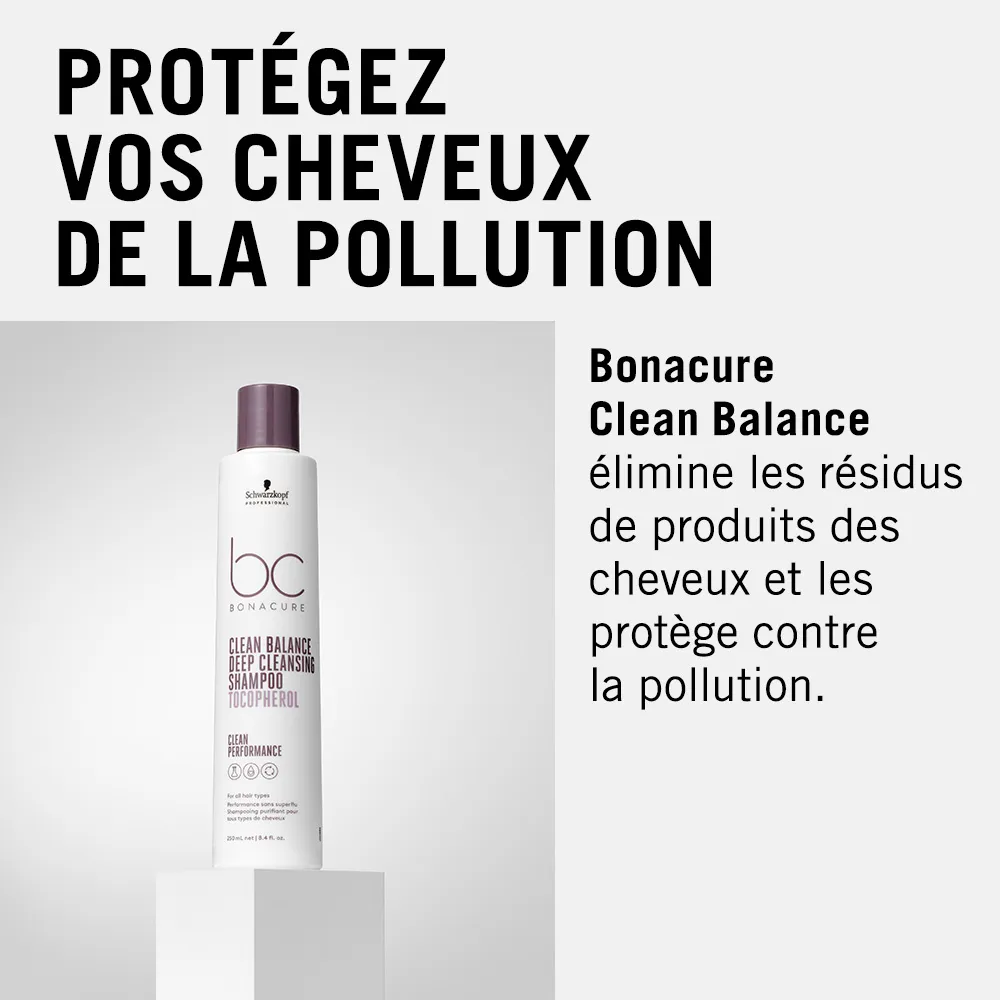 Le shampoo sans sulfate Schwarzkopf BC. Bonacure Clean Balance Shampoo avec Tocopherol a été conçu pour éliminer les résidus de produits capillaires et protéger contre les radicaux libres et la pollution environnementale. Une excellente méthode pour éliminer les polluants environnementaux et créer une sensation de fraîcheur capillaire - jusqu'à 24 heures. Effets du Schwarzkopf BC Bonacure Clean Balance Deep Cleansing Shampoo La formule avec Tocopherol combat les radicaux libres et protège les cheveux contre la pollution en encapsulant la poussière et autres particules. Le shampooing nettoyant en profondeur de Schwarzkopf nettoie en douceur mais efficacement le cuir chevelu et les cheveux. La formule en profondeur avec Tocopherol enveloppe les résidus et les accumulations, protégeant ainsi les cheveux contre les radicaux libres. En nettoyant en profondeur, il est idéal comme étape préalable avant des traitements chimiques. Cependant, il est conseillé d’éviter un massage du cuir chevelu avant un traitement chimique. Pour qui le shampooing est-il adapté ? Pour tous les types de cheveux exposés à la pollution environnementale.