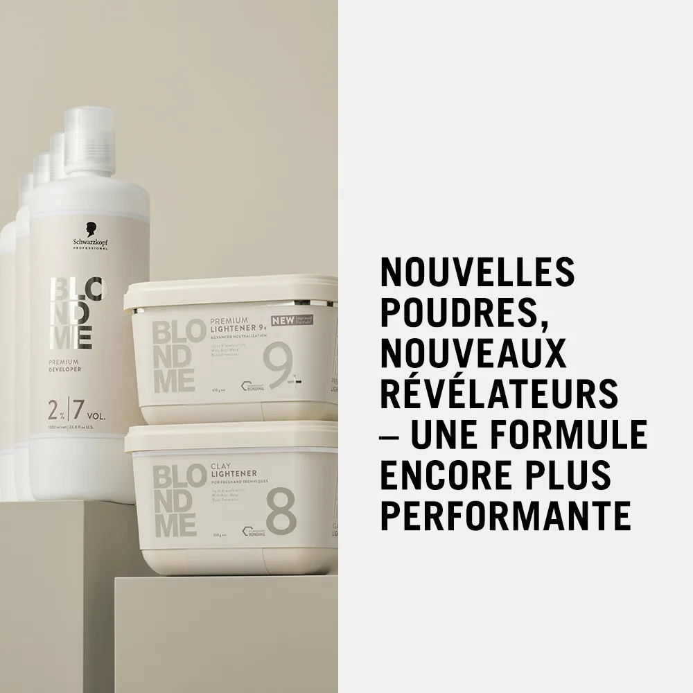 Le BlondMe Premium Lightener 9+ de Schwarzkopf est une poudre décolorante permettant un éclaircissement jusqu’à 9 niveaux. Convient à toutes les techniques et peut être utilisé avec les développeurs BlondMe Premium à 2 %, 6 % et 9 %*.Schwarzkopf Blondme Premium Lightener : Décoloration douce pour des résultats d’éclaircissement maximauxLe Premium Lightener avec technologie Bond Enforcing minimise la casse des cheveux grâce au Bond Protection System, qui protège activement la fibre capillaire pendant le processus de décoloration.Il permet ainsi une décoloration douce, très claire et nette. La poudre décolorante Schwarzkopf ne protège pas seulement les liaisons capillaires, mais en construit également de nouvelles lors de la décoloration. La décoloration premium assure un éclaircissement puissant tout en maximisant la protection des cheveux.Conseils d’utilisation pour Schwarzkopf Blondme Premium Lightener 9+Appliquer sur cheveux secs.Convient pour une utilisation avec ou sans contact avec le cuir chevelu.Pour applications globales, techniques en feuille et corrections de couleur.L’éclaircissement le plus doux jusqu’à 3 niveaux est possible avec le Developer 2% 7 Vol.Avec le Developer 6% 20 Vol., l’éclaircissement peut atteindre jusqu’à 6 niveaux.Avec le Developer 9% 30 Vol., l’éclaircissement peut atteindre jusqu’à 9 niveaux (application sans contact avec le cuir chevelu uniquement).Laisser agir 20-45 minutes.Résultat avec Schwarzkopf Blondme Premium Lightener 9+jusqu’à 9 niveaux d’éclaircissementblond froid sans reflet jaunecheveux sainsNouvelles liaisons capillairescasse minimaleExcellente qualité capillaire*à utiliser uniquement sans contact avec le cuir chevelu. L’éclaircissement puissant met particulièrement l’accent sur la protection des liaisons capillaires tout en offrant un éclaircissement maximal.