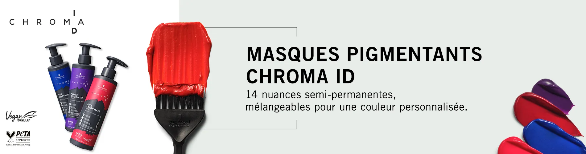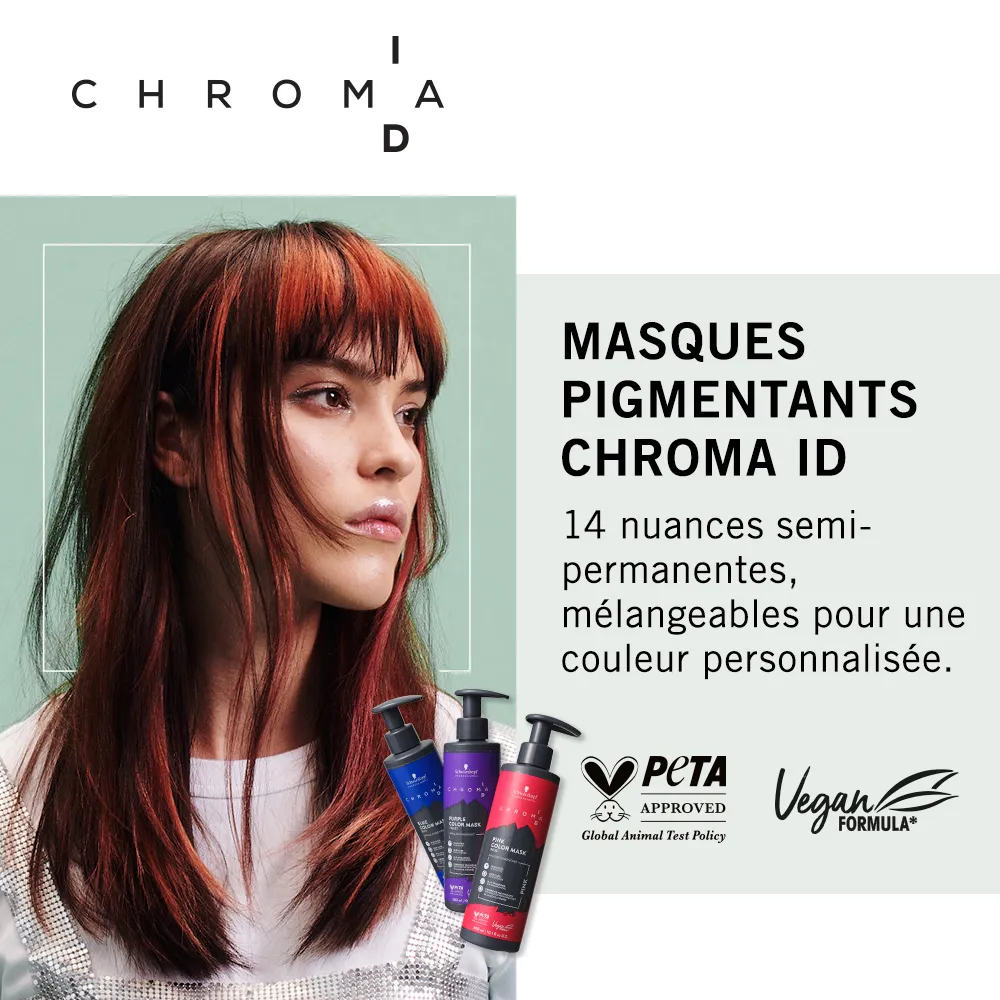 Couleur et soin réunis dans un seul masque ! Découvrez CHROMA ID, le premier système Mix & Tone de Schwarzkopf Professional pour une intensité de couleur maximale, sans endommager les cheveux et sans engagement permanent envers une teinte.