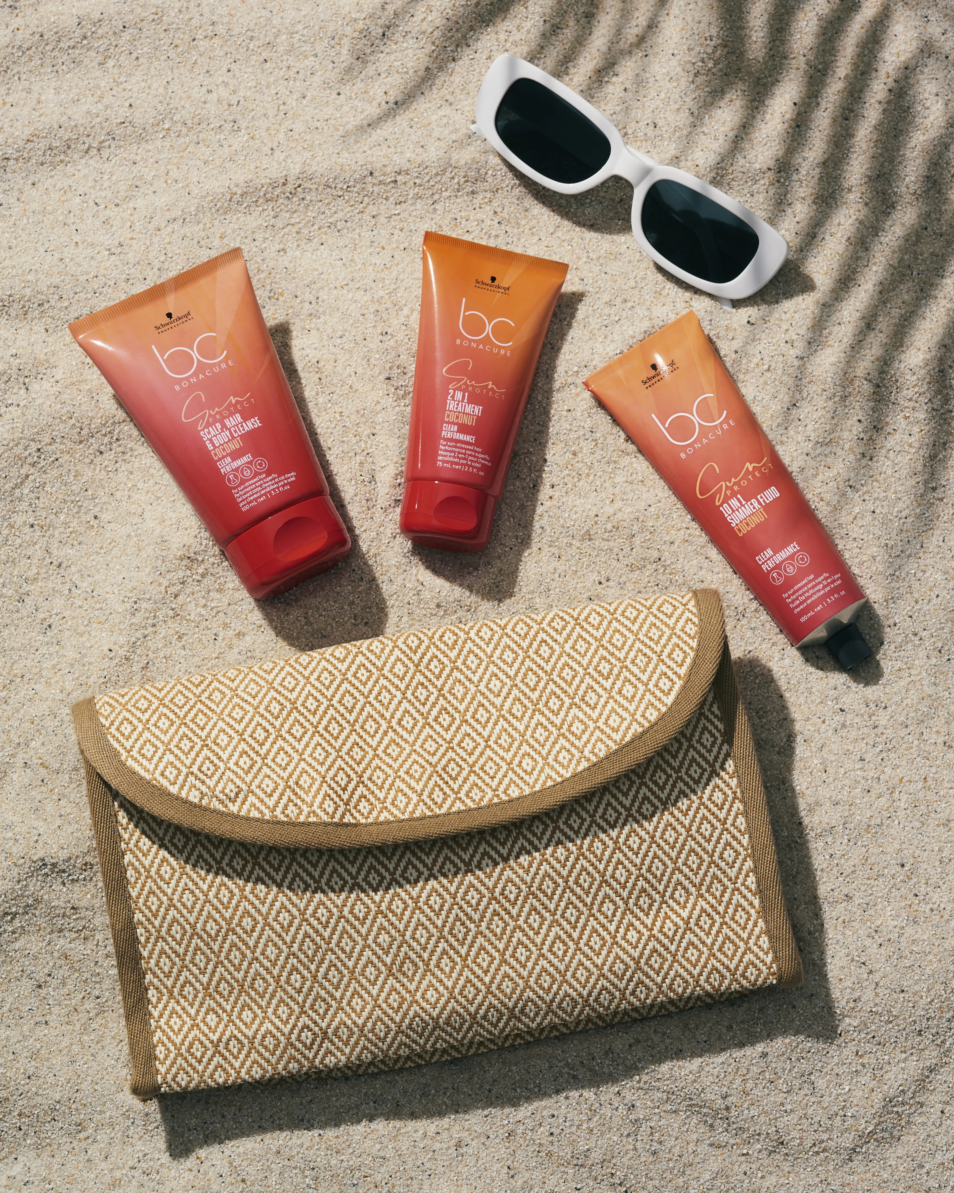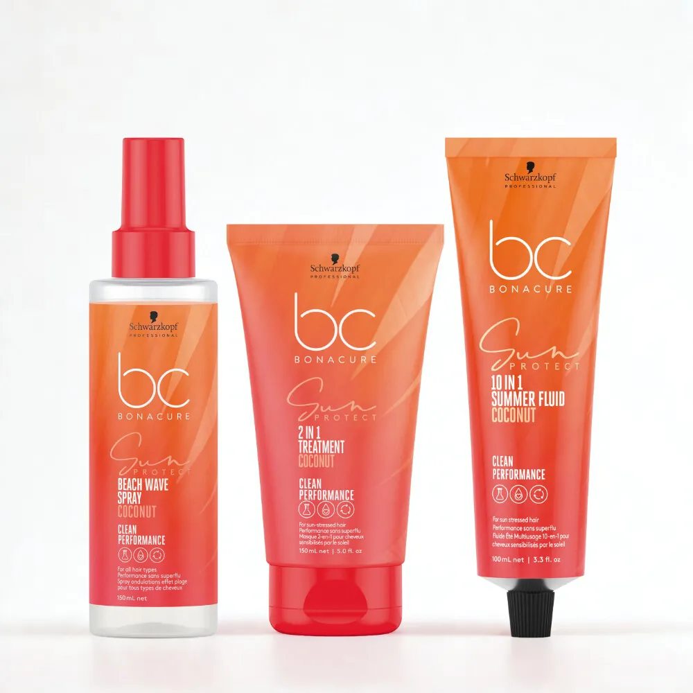 - Protection & Coiffage: Pendant l’exposition au soleil, appliquez plusieurs fois par jour le Schwarzkopf BC 10-in-1 Fluid pour protéger les longueurs et pointes. Terminez avec le BC Sun Protect Beach Waves Spray pour un look d’été parfait.