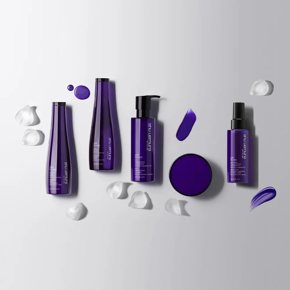 Yūbi Blonde de Shu Uemura est une gamme de soins spécialisée pour la soin et la neutralisation des cheveux blonds décolorés et mèchés.